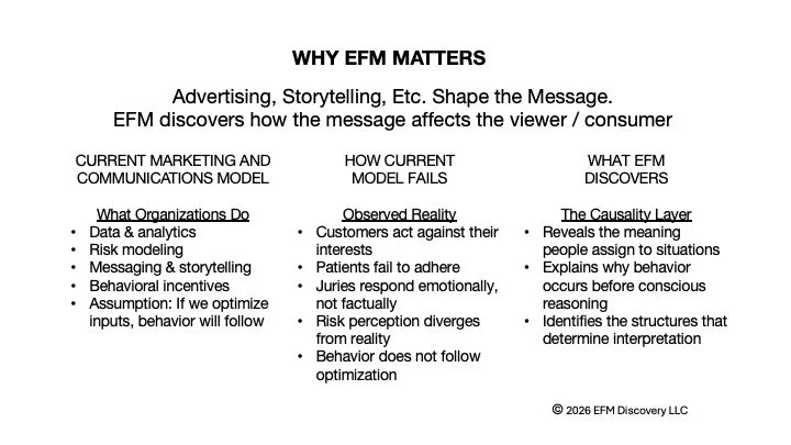 Over time EFM became a causal meaning system: a way of mapping the behavioral unconsciousᵀᴹ with precision, clarity, and predictive power. EFM is not merely a research method; it is the structured field of human meaning that produces behavior.